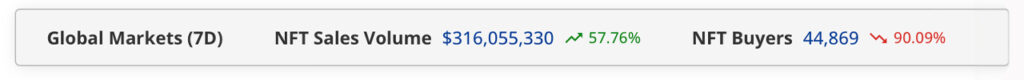 This previous week’s NFT gross sales amounted to roughly $316 million. Regardless of this surge, the quantity of patrons and sellers decreased significantly, dropping 90.09% and 88.31% respectively, as per the seven-day knowledge from cryptoslam.io.