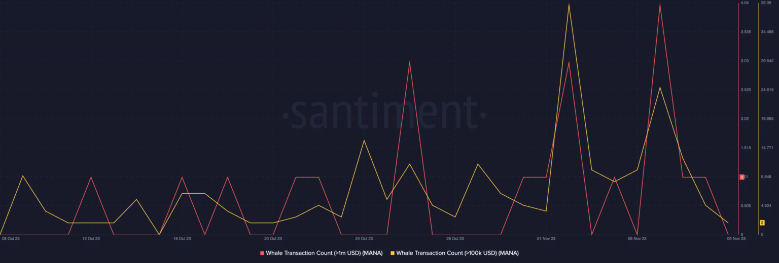 - The amount of whale transactions involving MANA has risen previously few days.