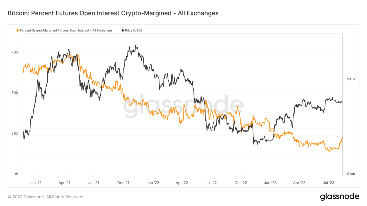 Based on information from Glassnode, the p.c of futures open curiosity that’s margined within the native coin of the contract (e.g., BTC and ETH) at present stands at 28.8%. This determine reached an all-time low on July 3, dropping to 21.8%.