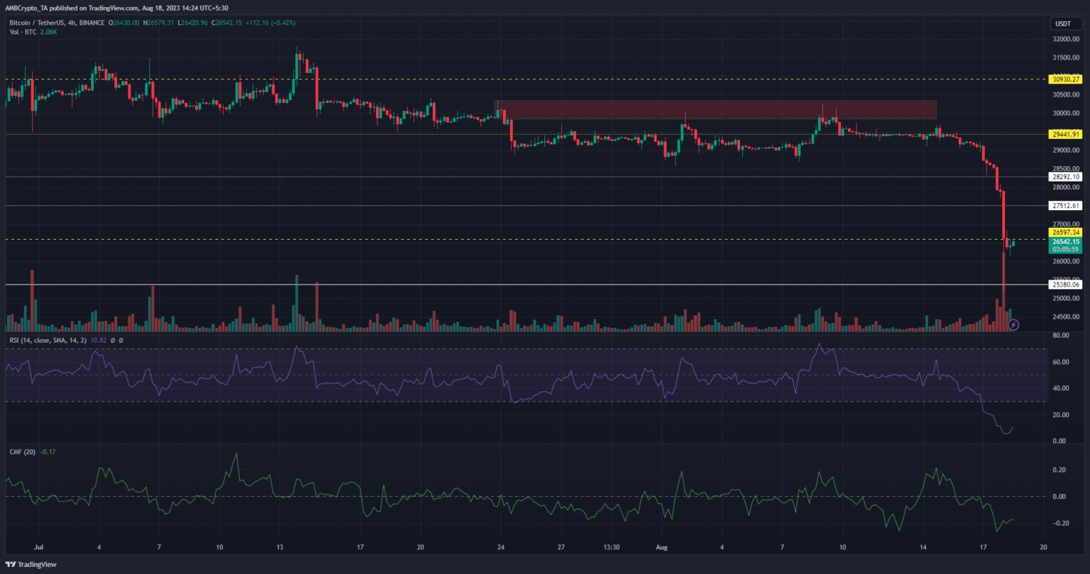 The occasions of the previous 24 hours shook the crypto market, with Bitcoin [BTC] experiencing a 13% dip over the previous day. This noticed the king coin briefly contact the $25k worth zone earlier than recovering to commerce at $26.5k, as of press time.