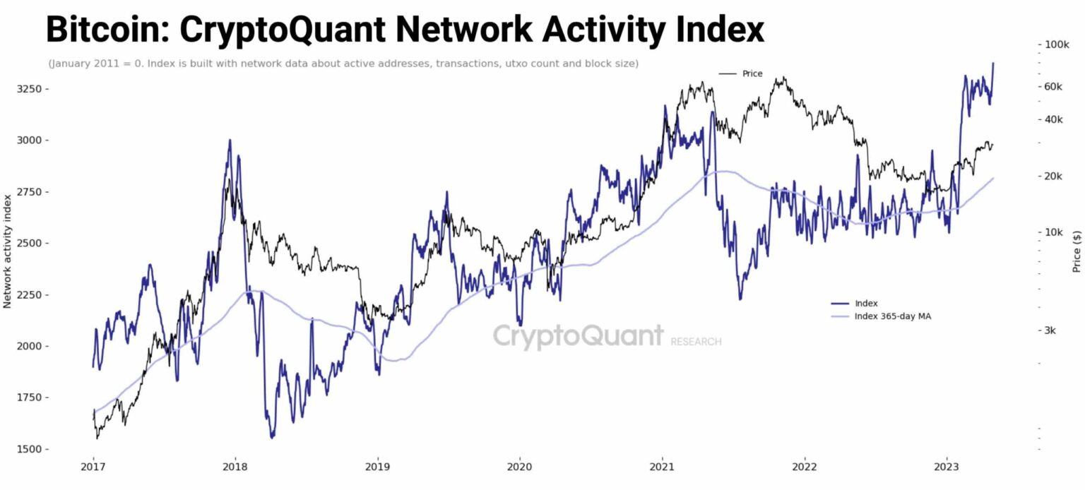 Blockchain analytics agency CryptoQuant devised a Bitcoin Community Exercise Index to seize the burgeoning exercise on the chain. The index takes into consideration key indicators like transactions, addresses and demand for block area.