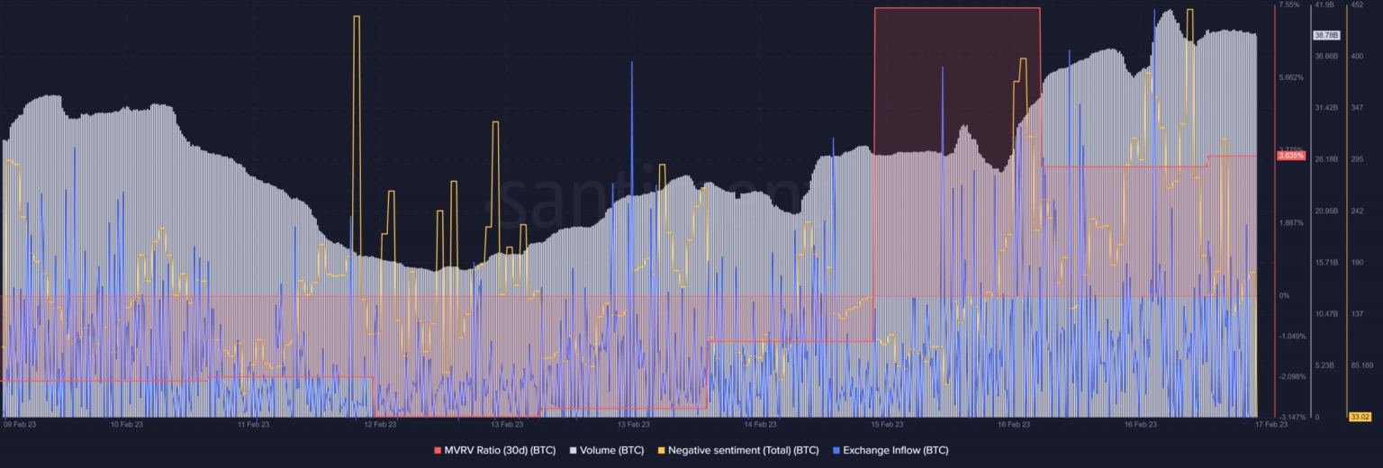 Santiment’s chart additionally identified a couple of attention-grabbing metrics. BTC’s latest worth decline was accompanied by excessive quantity, additional legitimizing the downtrend. Destructive sentiments round BTC spiked in the previous couple of days, indicating much less belief amongst buyers within the coin. Furthermore, BTC’s alternate influx elevated significantly.