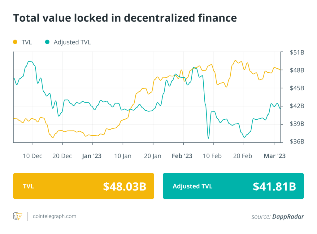 Analytical information reveals that DeFi’s whole market worth remained under $50 billion this previous week. Knowledge from Cointelegraph Markets Professional and TradingView exhibits that DeFi’s high 100 tokens by market capitalization had a bearish week, with a lot of the tokens buying and selling in crimson, barring a number of.