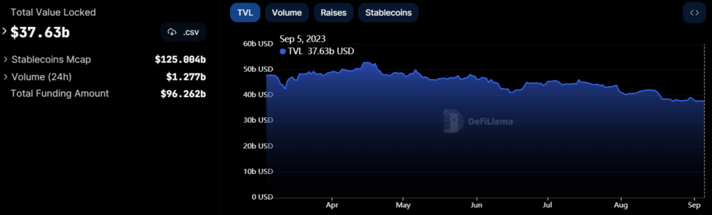 In keeping with knowledge supplied by DeFi Llama, the overall decentralized finance (DeFi) TVL has been consistently dropping since April from a neighborhood high of round $52.9 billion. Consequently, the TVL has dropped to $37.6 billion, final seen in February 2021.