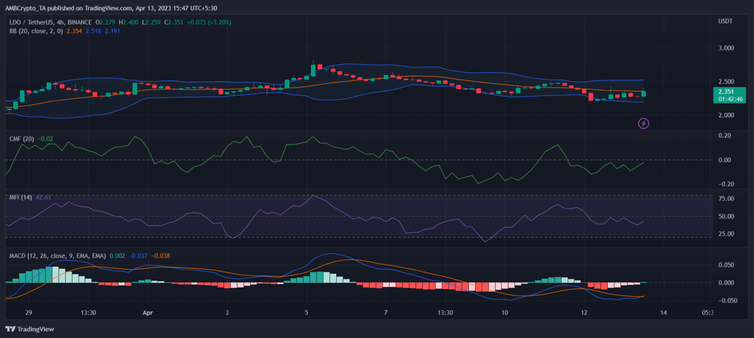 Curiously, LDO’s value elevated by greater than 7% within the final 24 hours. At press time, it was buying and selling at $2.38 with a market capitalization of over $2 billion. A have a look at LDO’s four-hour chart advised that the uptrend might proceed additional. As an illustration, LDO’s Chaikin Cash Movement (CMF) registered a pointy uptick and was headed in direction of the impartial mark.