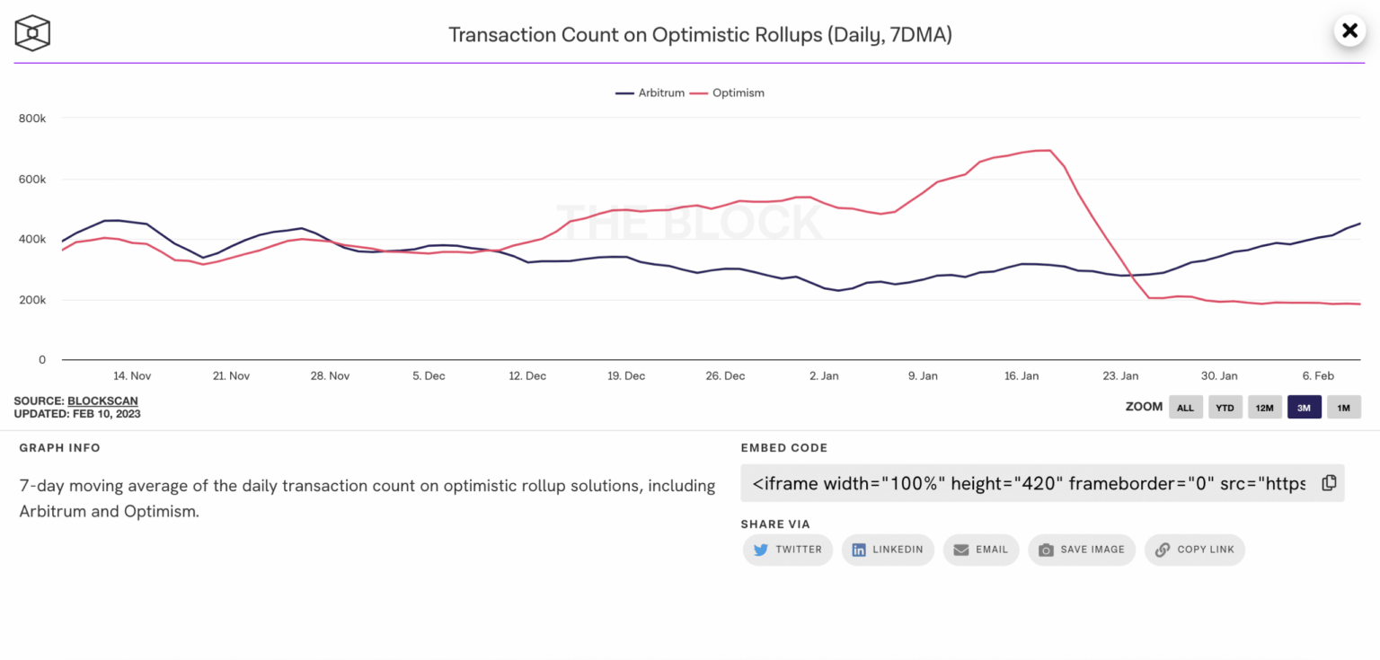 Based on information from IntoTheBlock, a comparability of exercise between Optimism and Arbitrum confirmed that the day by day transaction rely of Arbitrum surpassed that of Optimism shortly thereafter.