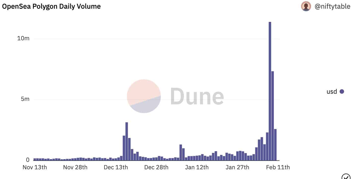 Whereas the above represents the amount on OpenSea, issues are a bit totally different on-chain. Polygon’s complete NFT trades quantity on-chain metric reveals a surge in exercise on 10 February.