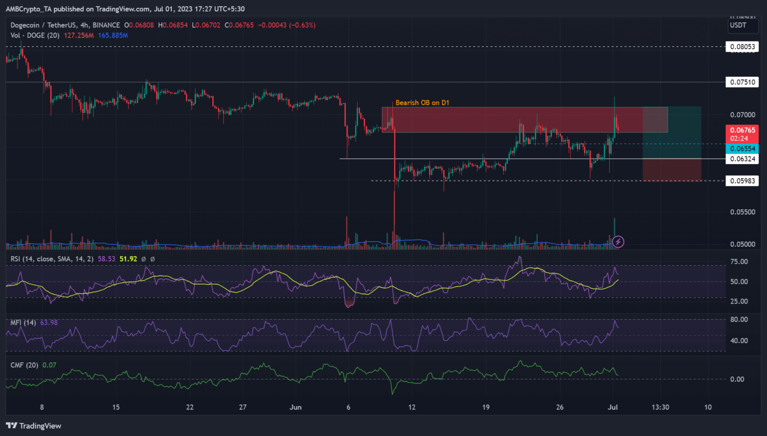 Dogecoin [DOGE] has struggled to swing past $0.07000 since 22 June decisively. Additional upside past $0.07000 has been persistently stopped by the bearish order block (OB) of $0.06729 – $0.07120 (crimson) on the day by day timeframe.