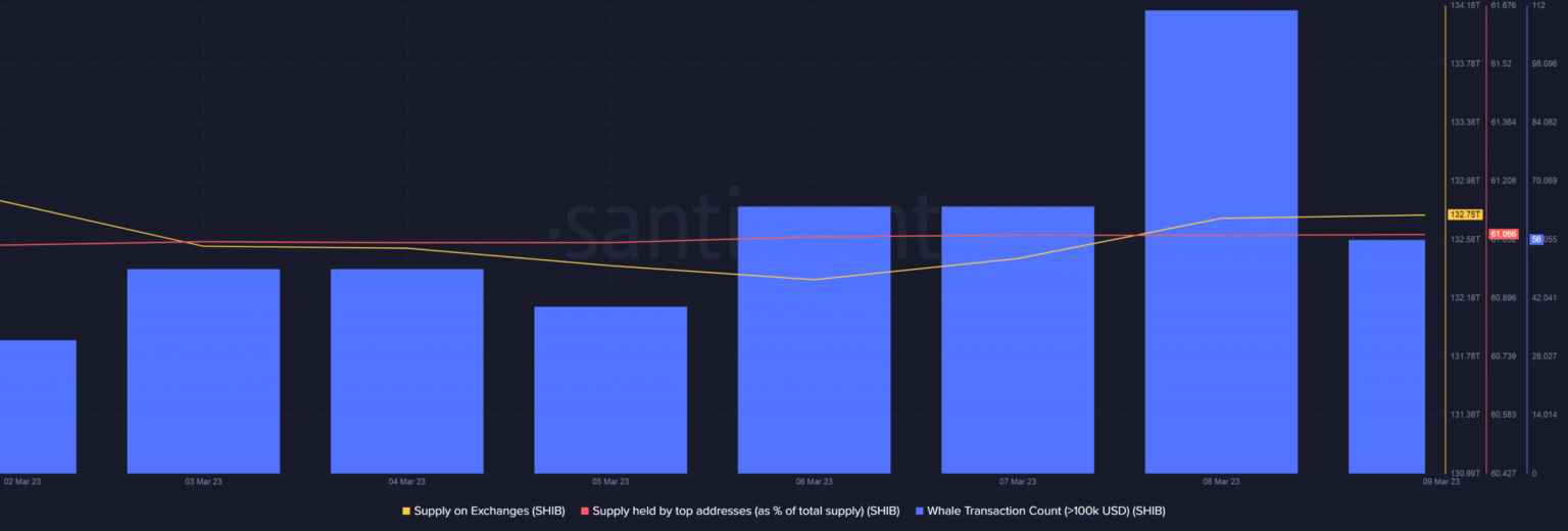In response to Santiment, SHIB’s provide on exchanges elevated steadily over the previous week and reached the weekly excessive on 8 March. This urged that customers had been probably promoting off their holdings.