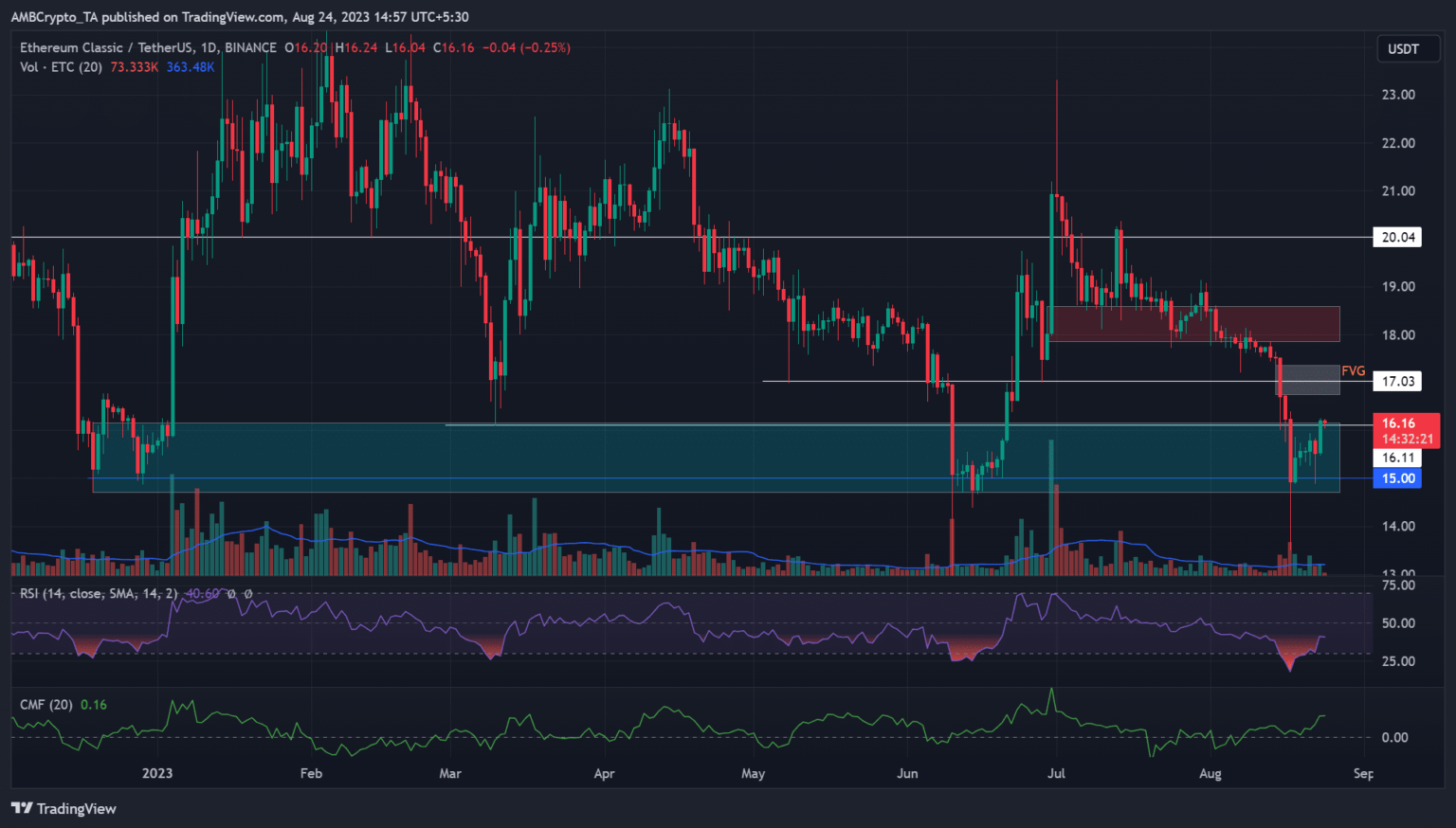 Ethereum Traditional [ETC] rebounded from crucial long-term assist of $14.7 – $16.2 (cyan). The assist zone has led to 3 consecutive value recoveries. However the latest restoration may face vital headwinds.
