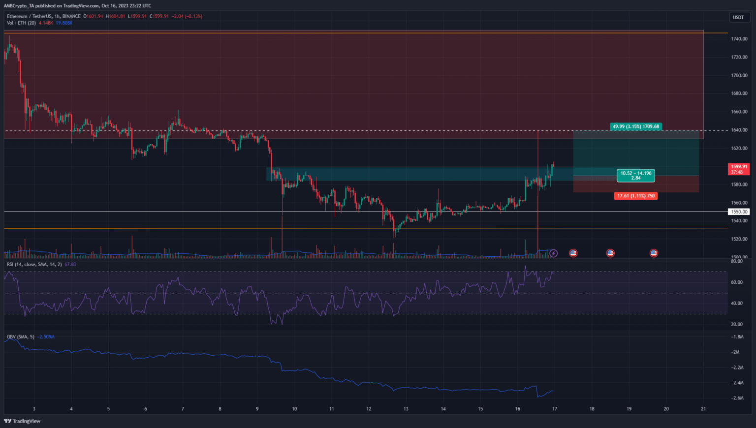 On the one-hour chart, ETH confirmed a powerful bullish outlook. Its market construction was bullish and has been so since 13 October when it climbed above $1555. The previous near-term resistance zone from $1585-$1600 has been shifted to a help zone. The Relative Power Index (RSI) was above impartial 50 and highlighted patrons have been extra dominant.