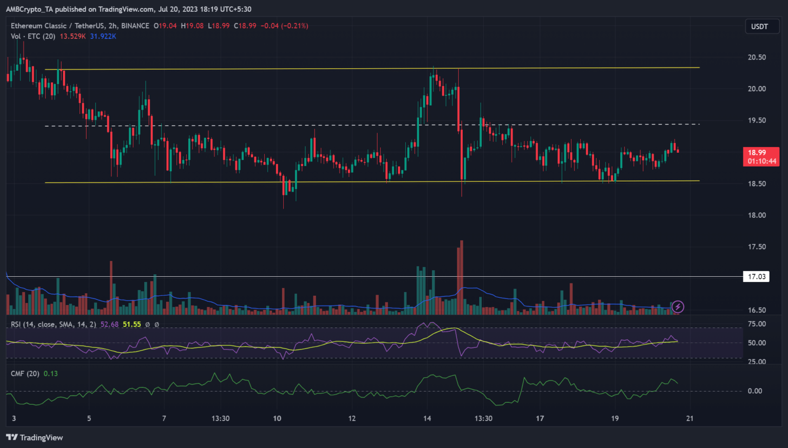 After the retracement in early July, ETC entered a variety formation inside $18.5 – $20.3. However the value motion has been restricted to the decrease vary of $18.5 – $19.5 since 15 July. In the identical interval, Bitcoin [BTC] struggled to clear its mid-range resistance degree of $30.5k.