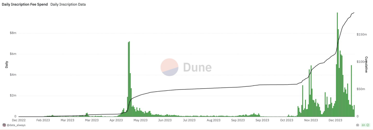 Because of the excessive exercise, by sixteenth December, the Bitcoin community recorded a single-day excessive of $10 million paid as charges to mint inscriptions on the blockchain, in response to information from Dune Analytics.