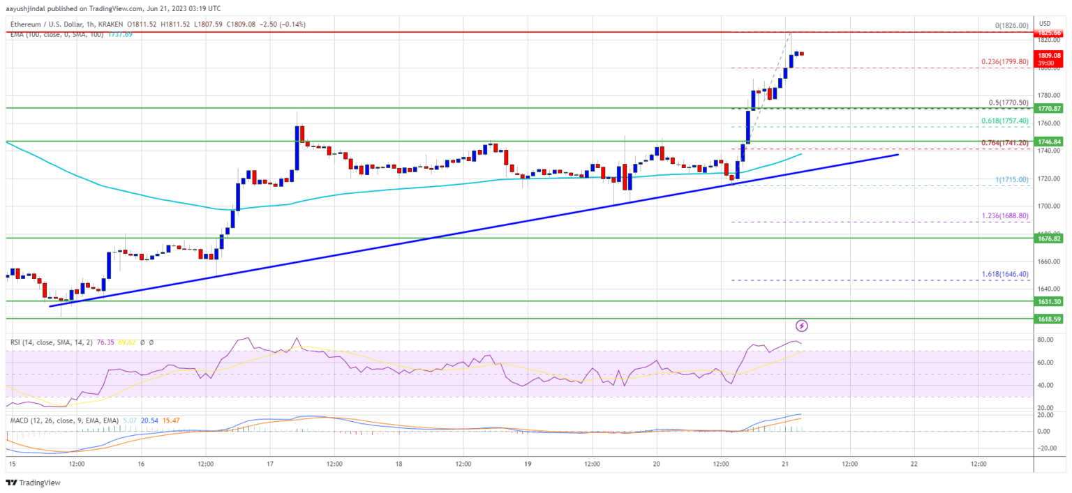 There was a break above the $1,770 resistance zone. It even spiked above $1,800. A excessive is shaped close to $1,826 and the worth is now consolidating beneficial properties. It’s nonetheless above the 23.6% Fib retracement degree of the current enhance from the $1,715 swing low to the $1,826 excessive.