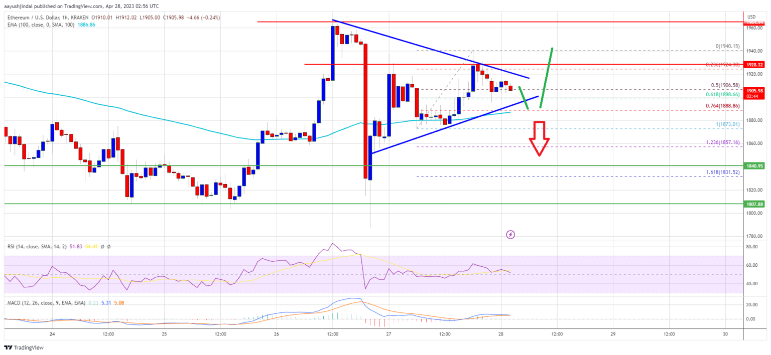 If Ethereum fails to clear the $1,925 resistance, it might begin one other decline. Preliminary assist on the draw back is close to the $1,890 stage and triangle pattern line.