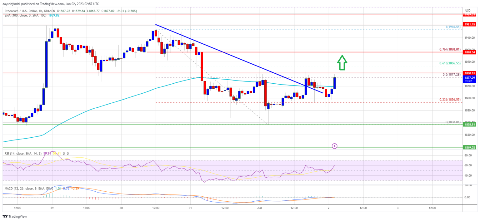 There was a break above the $1,870 resistance degree. The value climbed above the 23.6% Fib retracement degree of the downward transfer from the $1,916 swing excessive to the $1,838 low. In addition to, there was a break above a key bearish development line with resistance close to $1,870 on the hourly chart of ETH/USD.