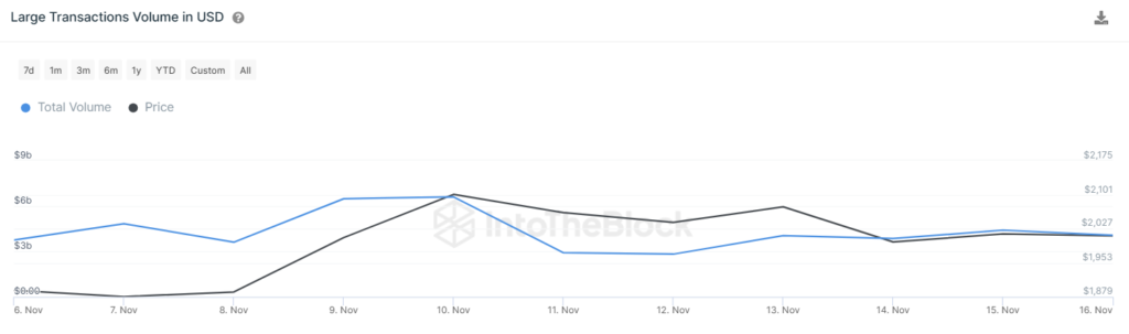 Additional insights from TradingView present that the ETH/BTC pair has reached its lowest level of the week, buying and selling at 0.053. This development factors to a rise in promoting actions available in the market. Moreover, there seems to be a decreased curiosity from main traders, or “whales,” as Ethereum’s worth couldn’t surpass the $2,100 threshold. Information from IntoTheBlock reveals a decline in whale transactions, dropping from a excessive of $6.6 billion to round $4 billion.