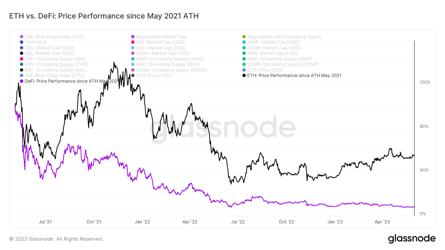 The info revealed that following the “DeFi Summer time” in January 2021, DeFi tokens launched into a extra fast upward trajectory than ETH. Nonetheless, this surge was short-lived, as a big drop occurred in Could 2021, adopted by a steady decline.