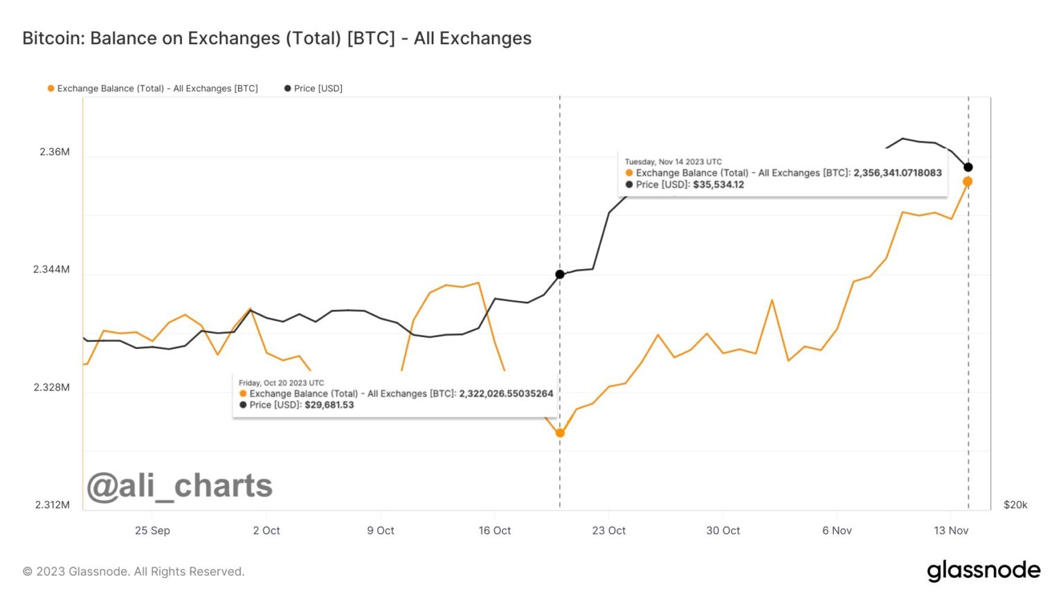As defined by analyst Ali in a brand new post on X, exchanges have seen hefty inflows lately. The related indicator right here is the “steadiness on exchanges,” which retains monitor of the overall quantity of Bitcoin within the wallets of all centralized exchanges.