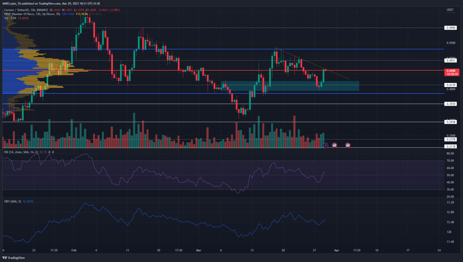 FTM merchants can count on some decrease timeframe ranging value motion within the coming hours. Thereafter, whether or not a breakout upward or rejection at $0.46 adopted remained to be seen. The OBV has been rising in March and indicated regular demand.