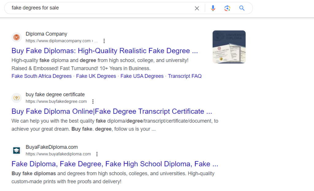A easy search reveals numerous websites providing faux diplomas. Supply: Google