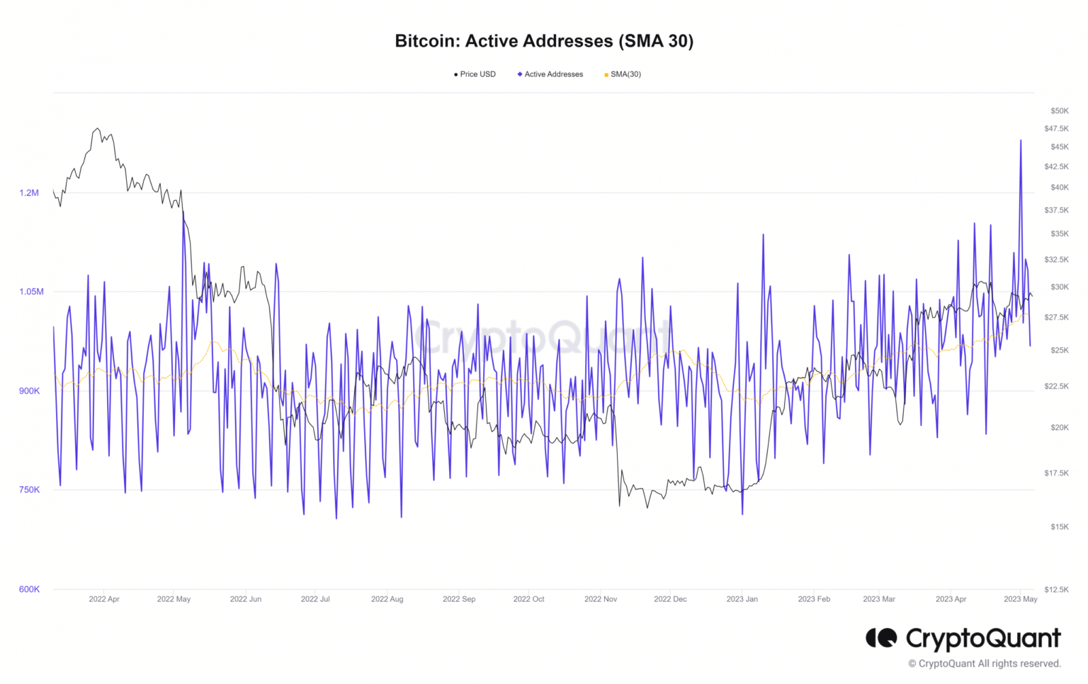Nevertheless, the sample collapsed on 1 Could. Energetic addresses metric skyrocketed to a brand new report of practically 1.3 million – the very best determine in over a yr.