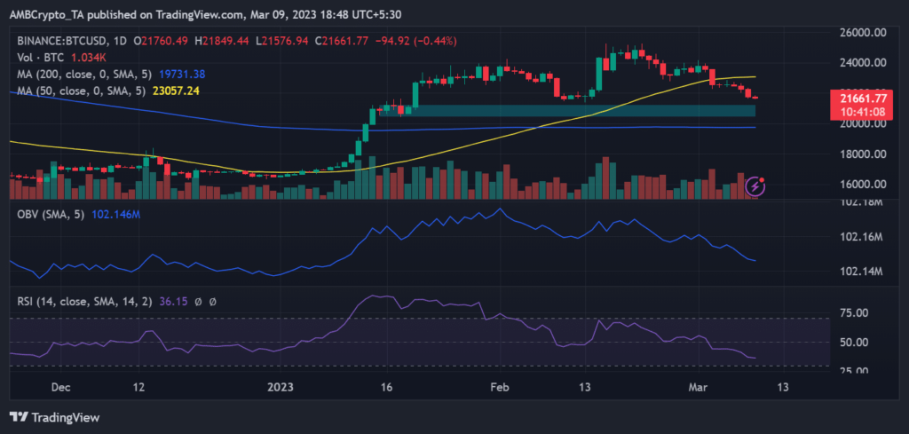 By the shut of buying and selling on 8 March, the BTC worth, when considered on a day by day timeframe, had dropped by a complete of two.21%. It was promoting at about $21,600 as of this writing, down about 0.40% in the identical timeframe.