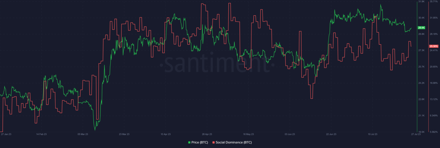 Within the wake of the FOMC’s charge hike choice on 26 July, Bitcoin assumed a extra distinguished place within the crypto discourse, evident from the social dominance metric. Earlier than the FOMC announcement, BTC’s social dominance had skilled a dip of roughly 22%.