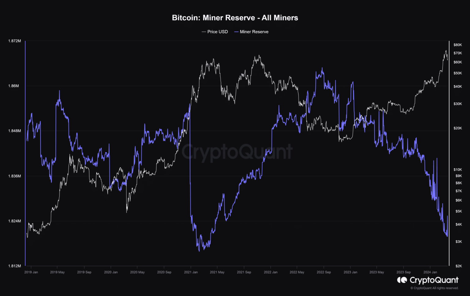 - Drop in miners’ reserves comes alongside Bitcoin’s value beneficial properties.