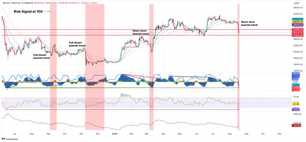 Wanting on the analysts’ chart, it seems that BTC tends to witness a corrective transfer when the Danger Sign hits 100.