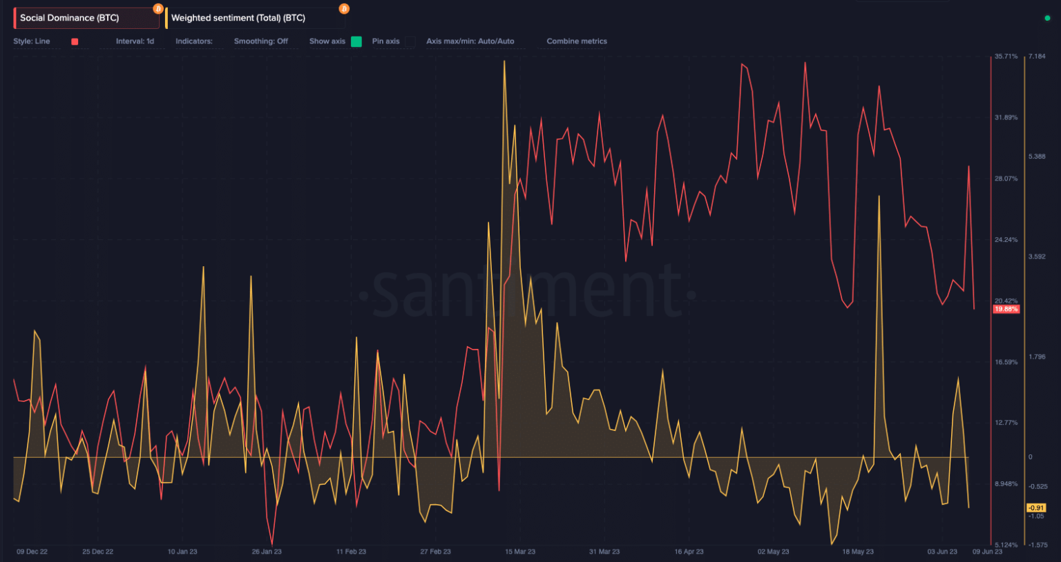 Used as a measure of the buyers’ notion towards an asset, the Bitcoin-weighted sentiment elevated to 1.45 on 6 June. Nevertheless, it had decreased to -0.91 on the time of this writing, insinuating a backpedal in optimism across the coin.