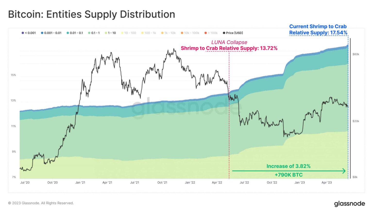 What’s fascinating to notice is that this cohort, composed of Shrimps (holding lower than 1 BTC) and Crabs (holding between 1-10 BTC), noticed one other sharp enhance in its share after the FTX chapter episode. Amongst different components, this was indicative of elevated demand for self-custody.