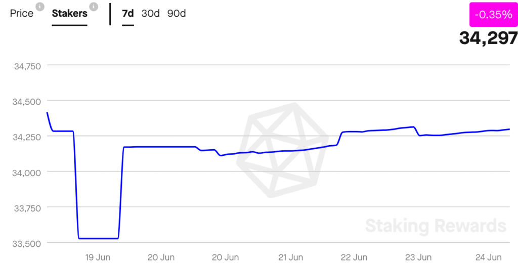 Regardless of this, curiosity in DOT staking has declined, as indicated by a 0.35% lower within the variety of stakers on the Polkadot community, in accordance with Staking Rewards’ knowledge.