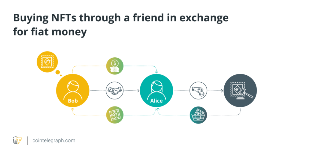 Shopping for NFTs via a good friend is an alternative choice for many who don’t personal cryptocurrency. Let’s take an instance of the situation the place Bob desires to buy an NFT however has no cryptocurrency. However Bob’s good friend Alice is prepared to buy the NFT on Bob’s behalf in trade for fiat cash or one other prearranged cost methodology. Alice is a cryptocurrency proprietor.