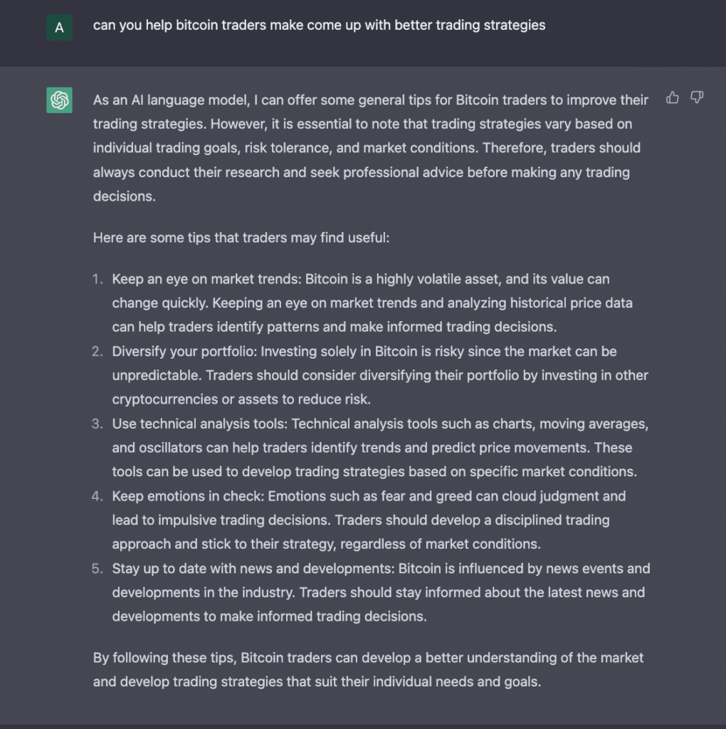 In November 2022, the AI mannequin ChatGPT was launched to the general public. In truth, it rapidly gained vital consideration too. With its broad vary of capabilities and flexibility, the query arises as as to if there are different ways in which ChatGPT can lend its experience, akin to aiding BTC merchants in formulating and making use of improved buying and selling methods.