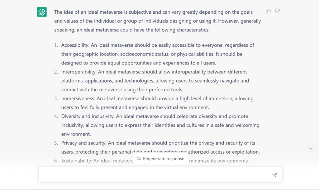 No matter its design or function, ChatGPT specified seven traits that an excellent Metaverse ought to comprise, which have been useful. Accessibility, Interoperability, Immersiveness, Creativity, and Innovation are just some traits ChatGPT listed as fascinating in a Metaverse. One would doubtlessly be inclined to concur that these are actually basic based mostly on the listing the AI produced.