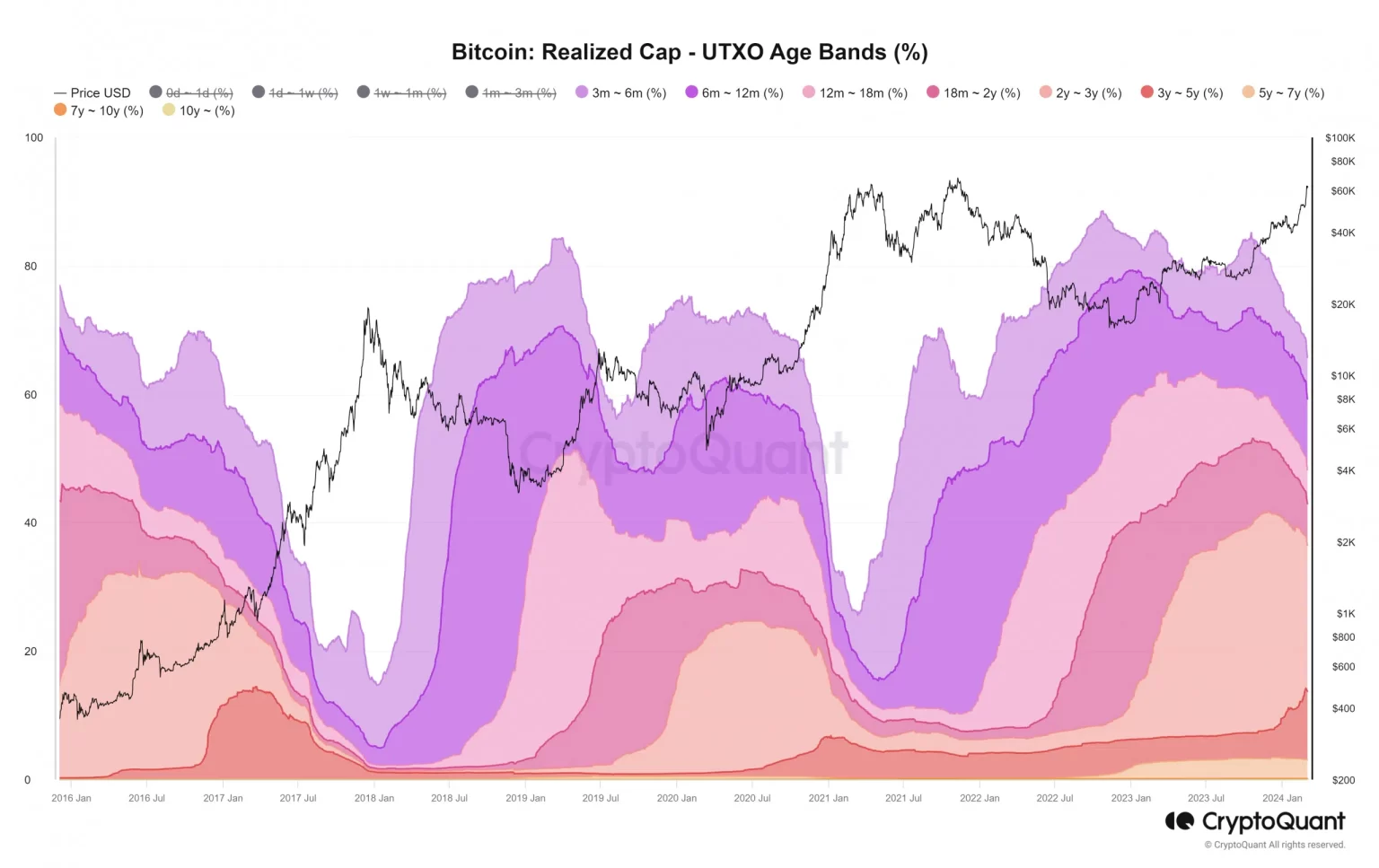 This metric exhibits the distribution of the realized cap of a specified age band. The realized cap is the full worth of BTC in circulation if purchased on the worth every coin final moved at. Every coloured band represents the ratio of the realized cap of UTXOs that have been final moved in that denoted interval.
