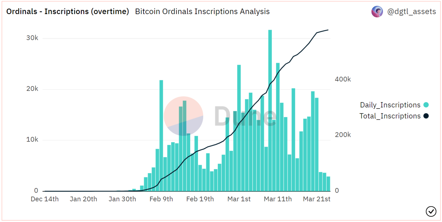 Dune dashboard from knowledge analyst dgtl_assets reveals that the Ordinals inscription exercise stays sturdy, with almost 580,000 NFTs inscribed in lower than three months.