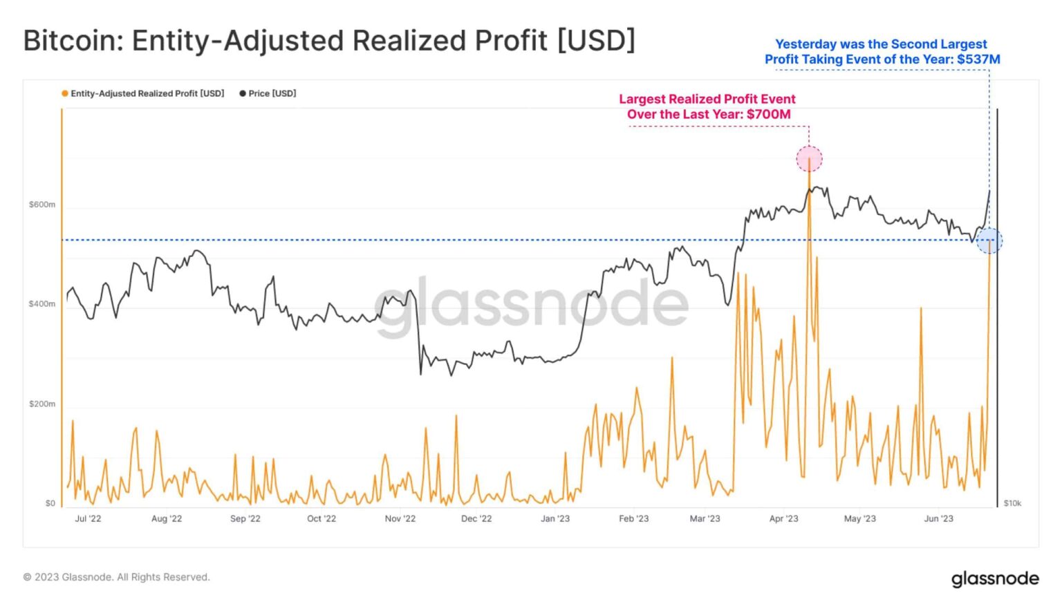 Glassnode, in one other tweet, identified a noteworthy improvement. As per the tweet, following the current uptick in Bitcoin worth motion, market members locked in a non-trivial $537 million in revenue, the second largest revenue taking occasion during the last 12 months.