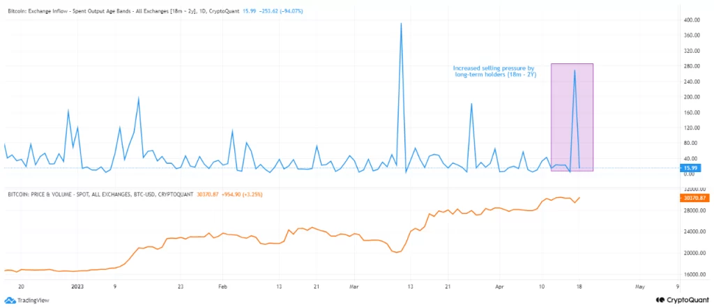 As per information from CryptoQuant evaluation by CryptoOnchain, an increase within the sale of BTC led to a value correction during the last 24 hours. As proven within the chart beneath, BTC long-term holders (18 months-2 years) promoting their BTC led to a drop within the value of the king coin.