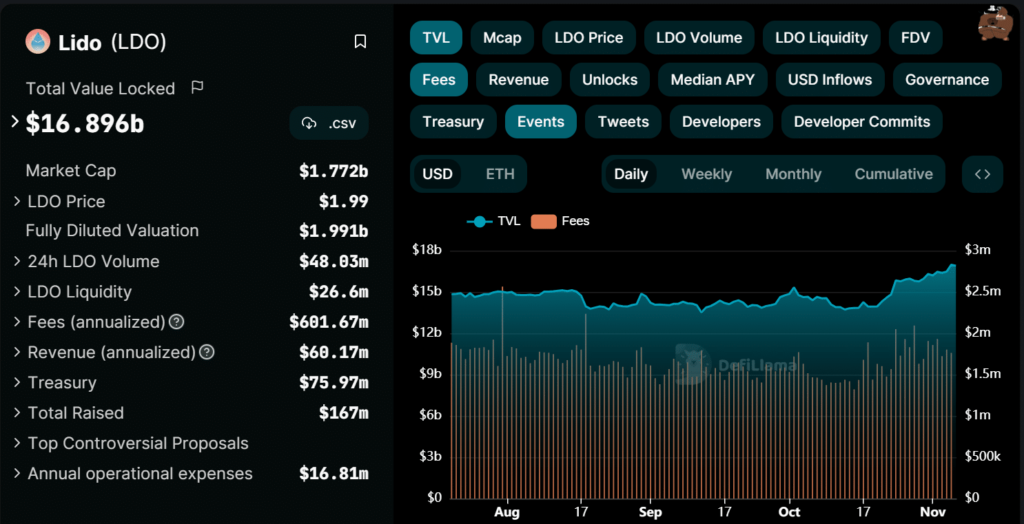 Moreover, an examination of the Complete Worth Locked (TVL) chart on the community confirmed elevated exercise. Between October and November, the TVL had surged by over $2 billion. Additionally, as of this writing, the determine was over $16.8 billion.