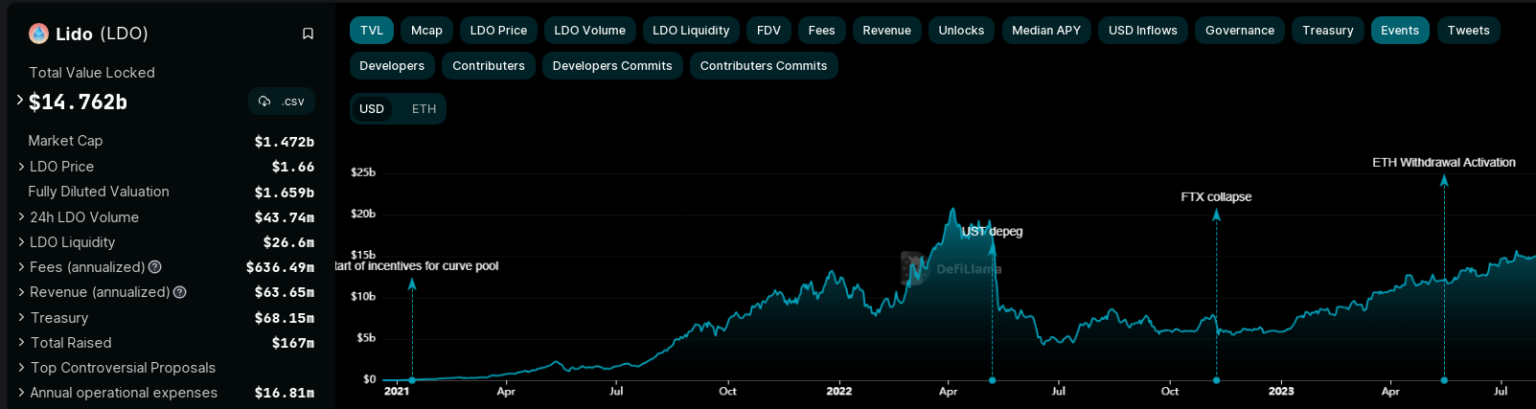 Lido Finance’s latest achievements underscore its rising prominence within the DeFi realm. With a present worth of $1.66 in response to CoinGecko, the platform’s token’s resilience (LDO) is additional affirmed by its 24-hour rally of 5.1%. Over the span of the final seven days, Lido has achieved features of 1.4%, a testomony to its unwavering efficiency even in difficult occasions.