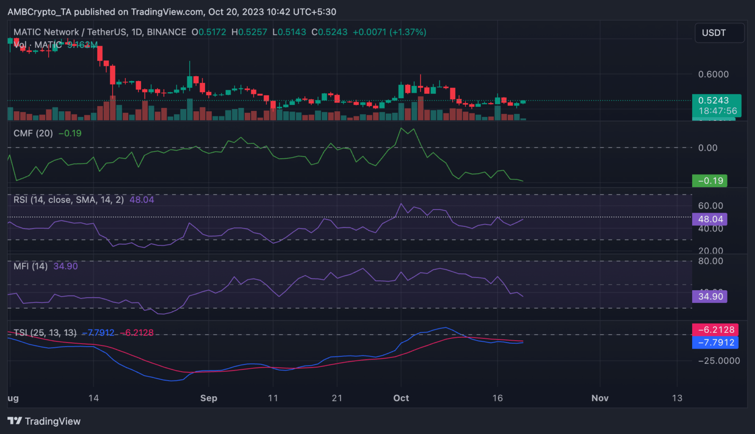 At press time, the value per MATIC coin was $0.5232, in response to knowledge from CoinMarketCap. Worth actions noticed on a each day chart revealed a sample of short-selling amongst each day merchants on the coin’s spot market since 11 October.