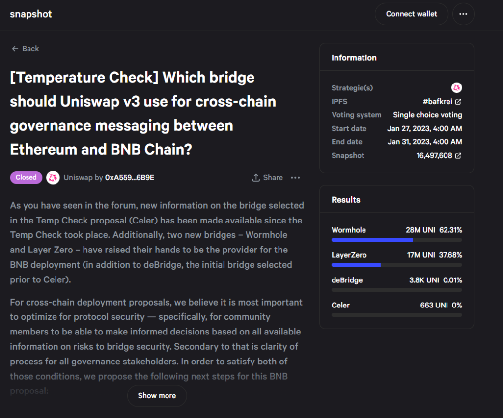 Within the debate main as much as the vote, many contributors concluded that Uniswap ought to use a number of bridges as a substitute of only one. This fashion, if one bridge grew to become hacked, the opposite bridges would reject the malicious messages despatched by it, and the assault can be prevented. Nevertheless, no multi-bridge resolution was out there on the time. Therefore, the proposal’s supporters argued that Wormhole must be used till a multi-bridge resolution could possibly be created.