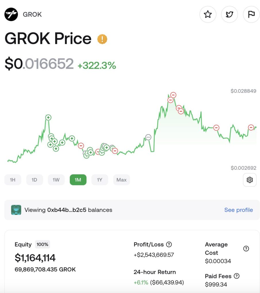At present, he/she nonetheless holds 69.87M GROK ($1.16 million), with a complete revenue of ~$2.5 million.”