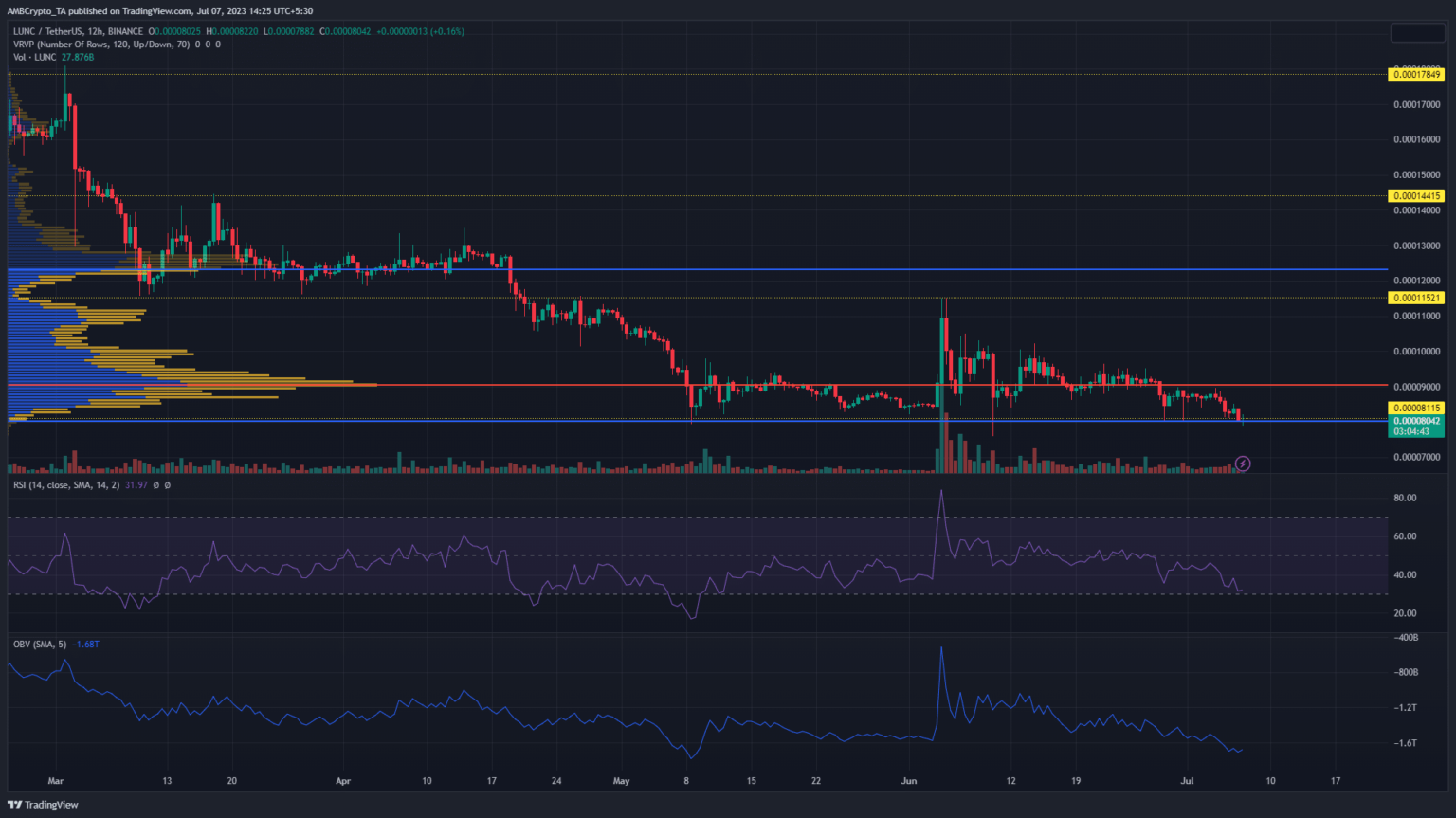 Luna Traditional’s [LUNC] weakening assist ranges have seen costs proceed to sink to all-time lows (ATLs). With bulls unable to stem the bearish slide, Luna Traditional dipped under the $0.00008115 assist stage as of press time.