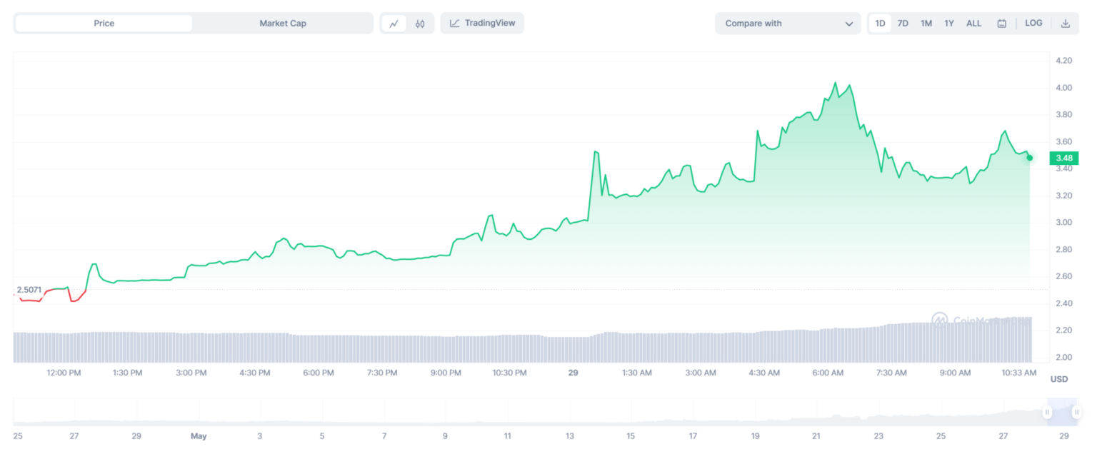 LBR, the native token of the Lybra Protocol, which offers holders with governance and entry to the protocol’s income, has elevated by 41% prior to now 24 hours and is at present buying and selling at $3.48.