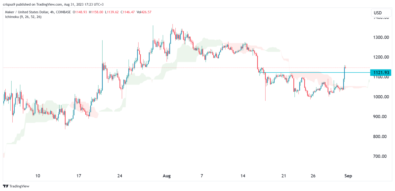 Maker (MKR) value rally continued as buyers watched the growth of the community in South Korea, one of many largest gamers within the crypto trade. The MKR token jumped to a excessive of $1,150 on Thursday, the very best stage since August sixteenth. It has soared by greater than 17% from the bottom stage in August.