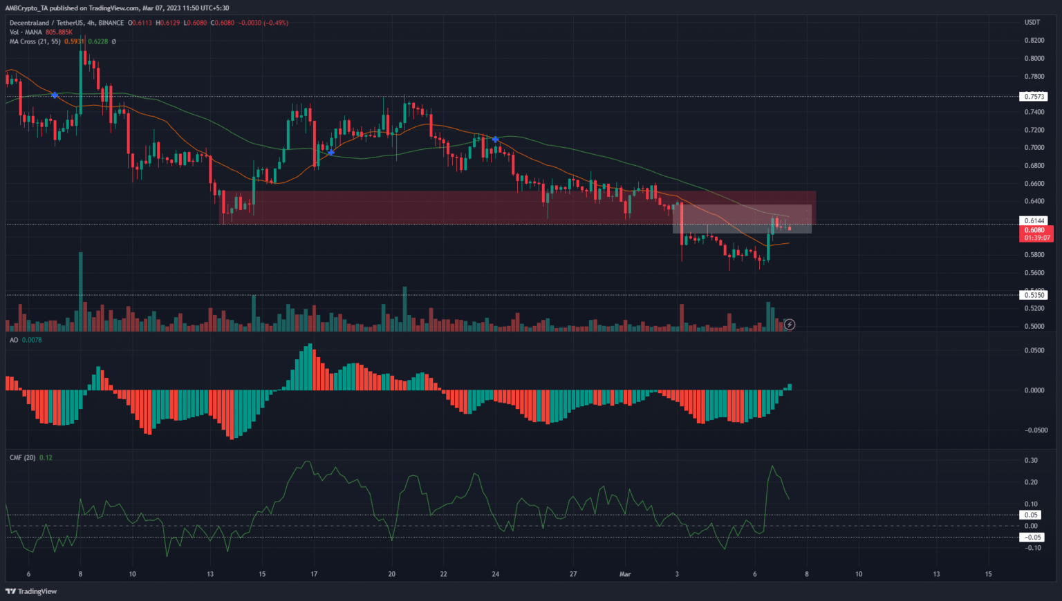 A bullish order block from 13 February was damaged throughout this dump and is now a bearish breaker block. Highlighted in crimson, this field has confluence with the resistance at $0.614 and the truthful worth hole. The market construction on H4 was additionally strongly bearish as MANA fashioned decrease highs and decrease lows since 24 February.