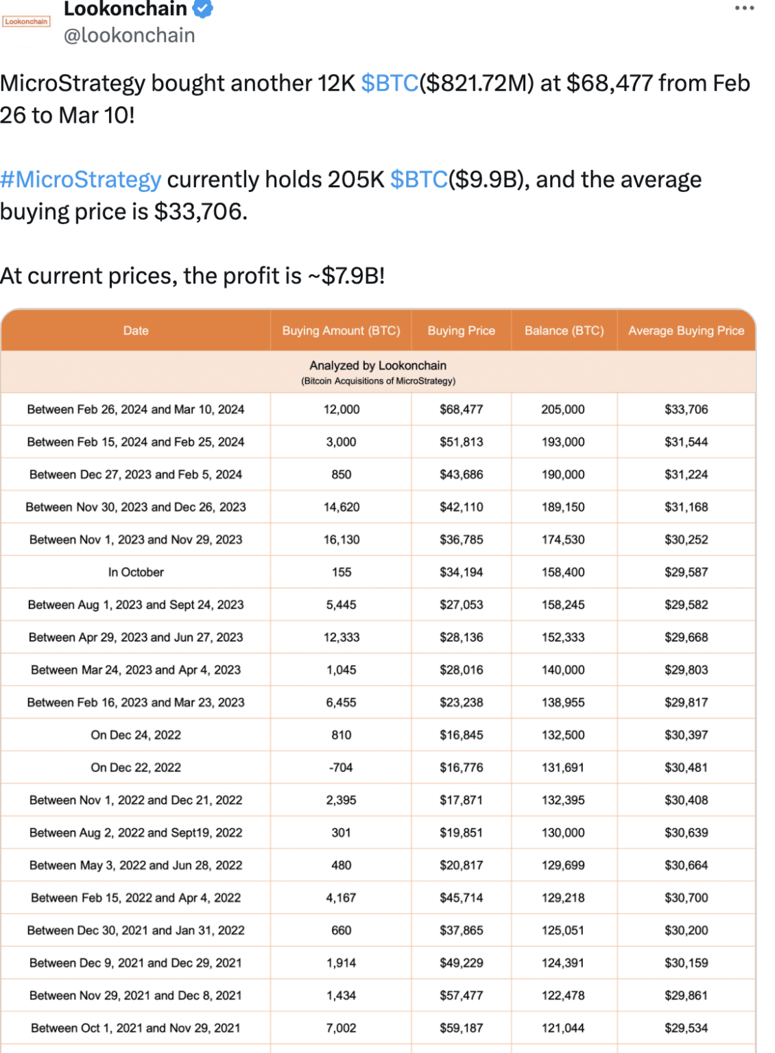 In response to information from Lookonchain, from the twenty sixth of February to the tenth of March, Michael Saylor’s firm, MicroStrategy acquired 12K BTC, totaling $821.72 million, at a mean worth of $68,477.